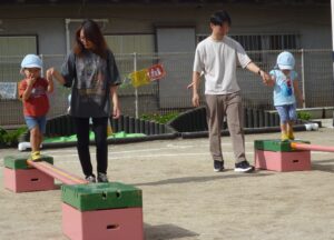 親子で慎重に平均台を渡ります。「ゆーっくり、ゆーっくり」