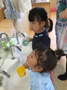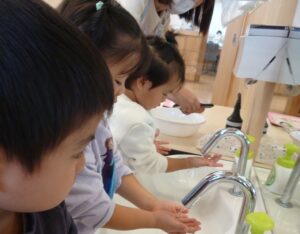 手洗いの音楽♪「あわあわてあらい」が流れるととても興味を示し、話を聞いていました。