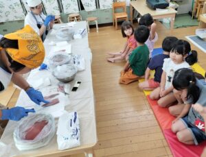 アジの三枚おろしをする様子を見てもらいました。生のお魚を見る機会は少ないので、真剣に見る子ども達でした。
