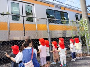 手を振ったり、電車の迫力に後ずさりする子どもたちでした。