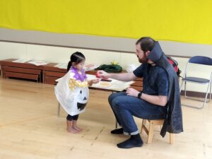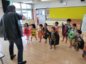 仮装をした英語の先生のサム先生と、子ども達でハロウィンパーティーしました。