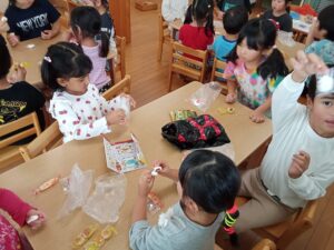 朝から楽しみにしていたお菓子をみんなで食べて、「美味しーっ!」「ちょっとびっくりしたけど楽しかった♪」と大盛り上がりの