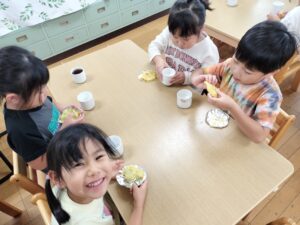 きりんさんがピーラーでさつま芋の皮むきをしてくれました。