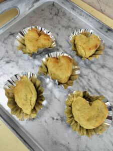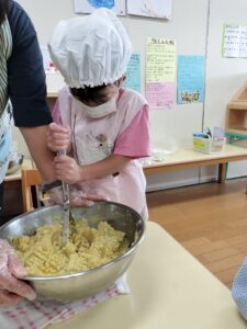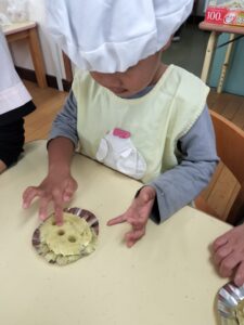 その後、卵や砂糖、生クリームを加え、それぞれに、自分で形を整えました。