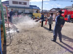 職員も消火器による消火訓練をしました。子ども達がいっぱい応援してくれましたよ。