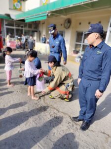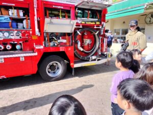 その後は、消防車や消防士さんの服などについて、実際に見たり、触ったりしながらいろいろなことを