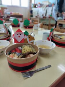 お昼ご飯は、かわいいサンタさんとトナカイのついたお皿で食べました。