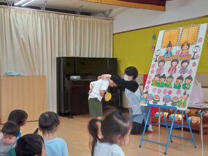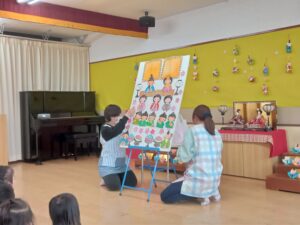 「たのしいひな祭り」の歌に合わせて、おひなさまが完成していくペープサートを楽しんだり、
