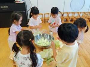 3歳児つき組は、オリエンタルサラダに入っているキャベツちぎり、