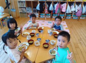 そして楽しみにしていた給食タイム!「おいしそ~!」「僕が切ったにんじんだ!!」と大喜びの子ども達でした。