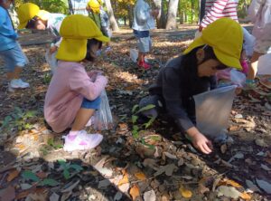 公園では、園内を散策したあと、みんなでどんぐり拾いをしました。「ほら見て!」大きなどんぐり見つけたよ!」「いっぱいあった~」と嬉しそうに見せてくれました。