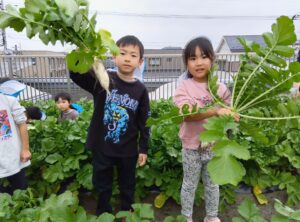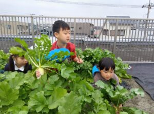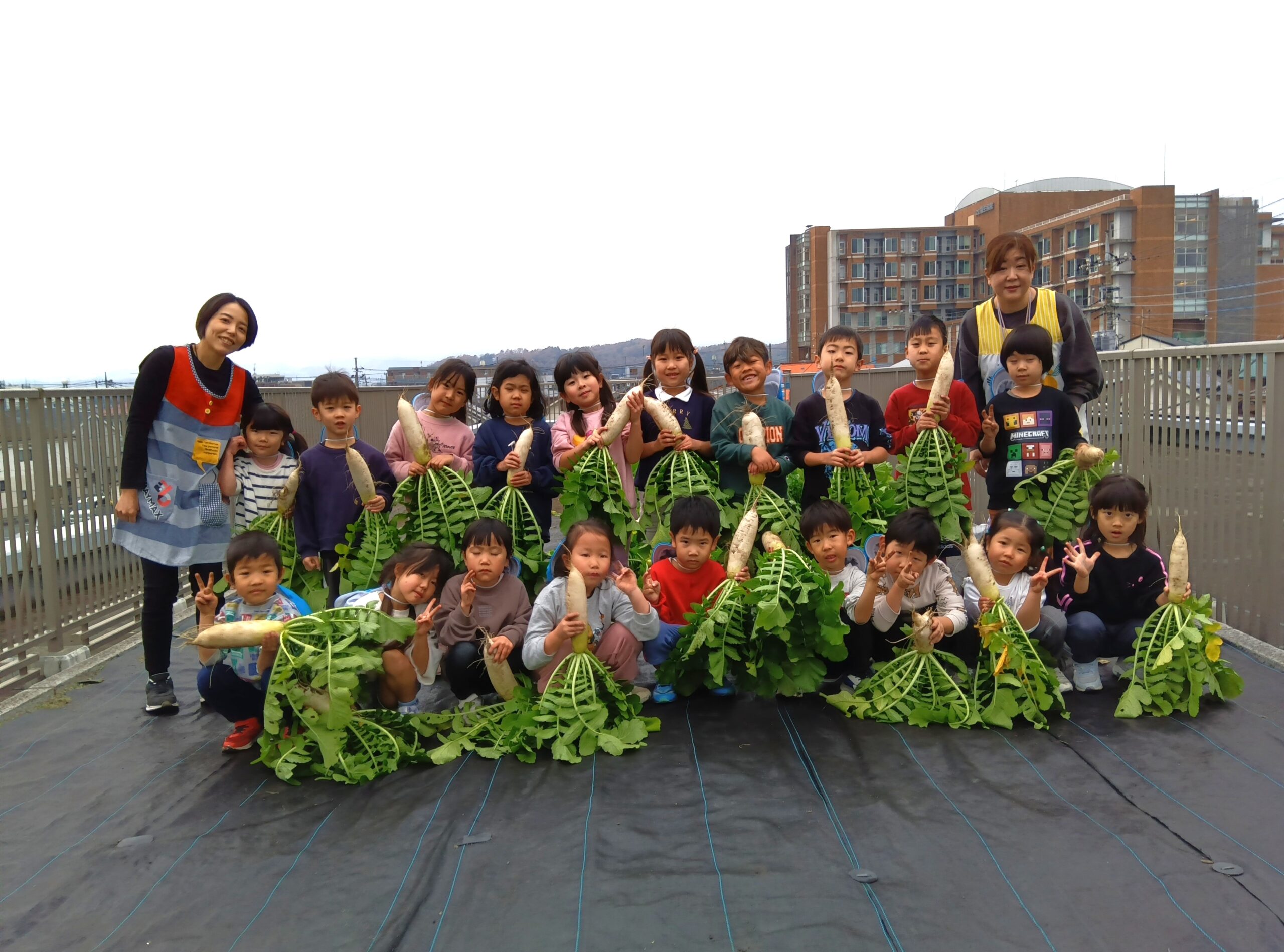 12月3日(水)、5歳児そら組が大切に育てた大根を収穫しました。「大きくなってる!」「葉っぱがすごーい!!」と大喜びの子ども達。