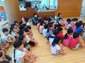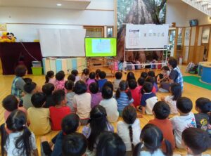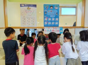 手に見えないバイ菌がついていて、怖い手になっていることを伝えると、「えーっ。そーなんだ!」「こわ~い!!」という声が聞かれました。さらに、看護師から病気になってしまうことを話されると、「しっかり手を洗う!」「ピカピカにする!!」と答えてくれました。