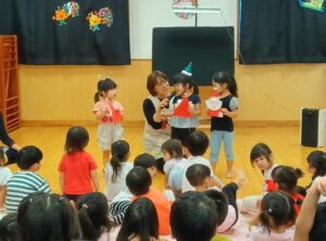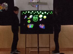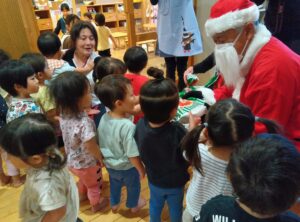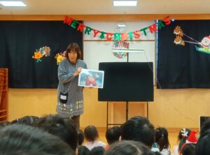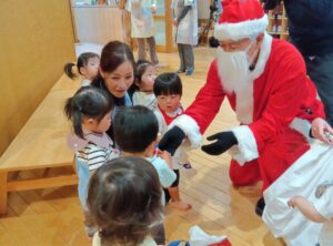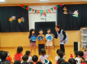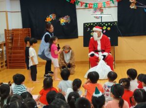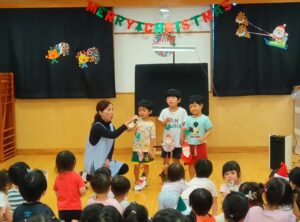 部屋の電気が消え、特殊な光を当てると光る様子に、「すご~い!」「あっ、光った!!」と喜んでいた子ども達です。「赤鼻のトナカイ」の歌も、元気いっぱい歌うことが出来ました。