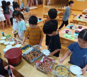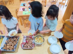 そして、今日の給食は特別メニューでした。2・3歳児はお部屋で、4・5歳児はランチルームで給食バイキング。