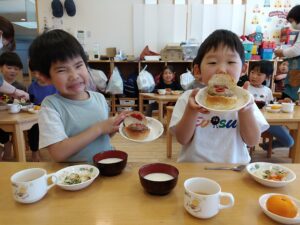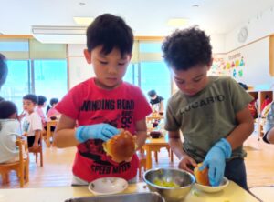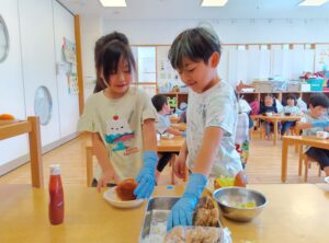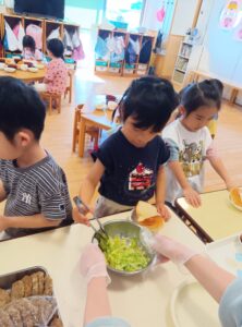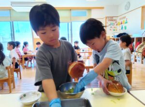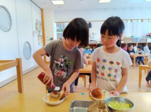 2月9日(月)、3・4・5歳児幼児組が給食メニューのハンバーガーのトッピングを行いました。